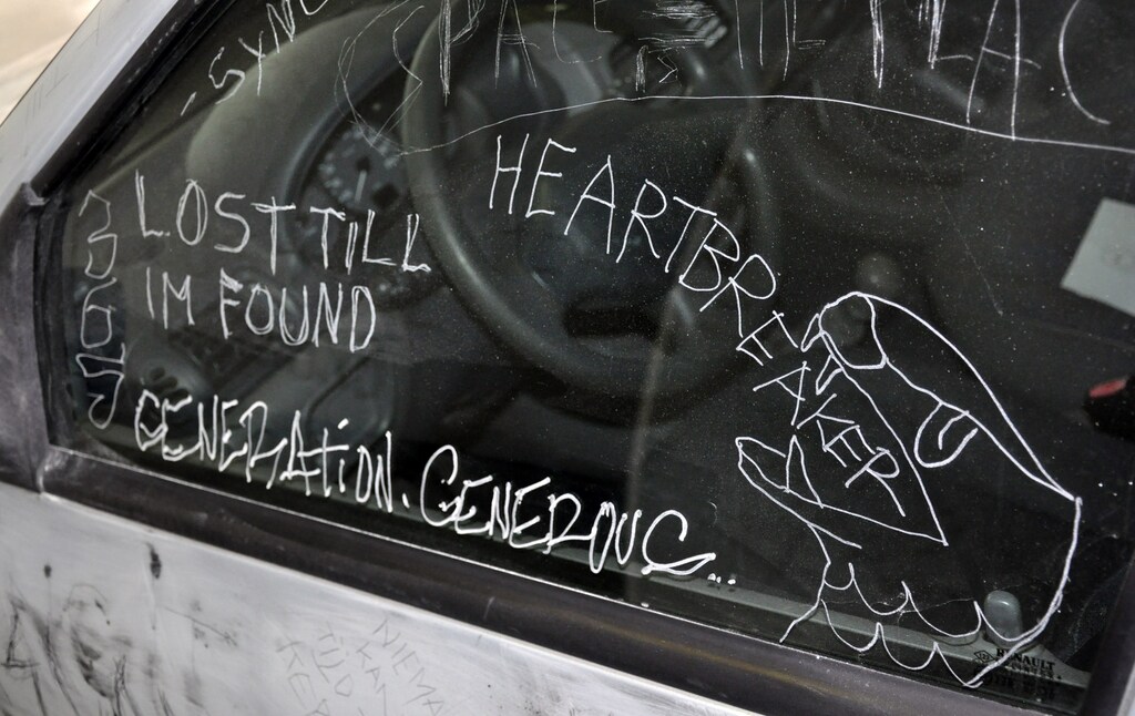 Messages about loss, isolation, fear, and resilience, covered the metal. As more people engaged with the surface, a spontaneous theme would emerge, guiding future inscriptions. The car became a social sculpture, its skin recording a layered narrative of the moment.